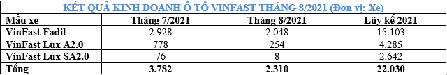 Ngày 10.09.2021, Công ty TNHH Kinh doanh Thương mại và Dịch vụ VinFast công bố kết quả kinh doanh ô tô tháng 08.2021, với tổng số 2.310 xe VinFast Lux và VinFast Fadil được bán ra trên thị trường.